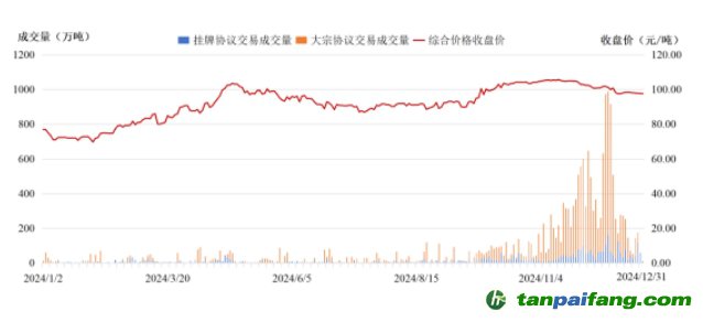 價格穩(wěn)中有升,年底收盤價為97.49元/噸,較2023年底上漲22.75%。配額清繳完成情況趨好,2023年度配額應(yīng)清繳總量52.44億噸,配額清繳完成率約99.98%。
