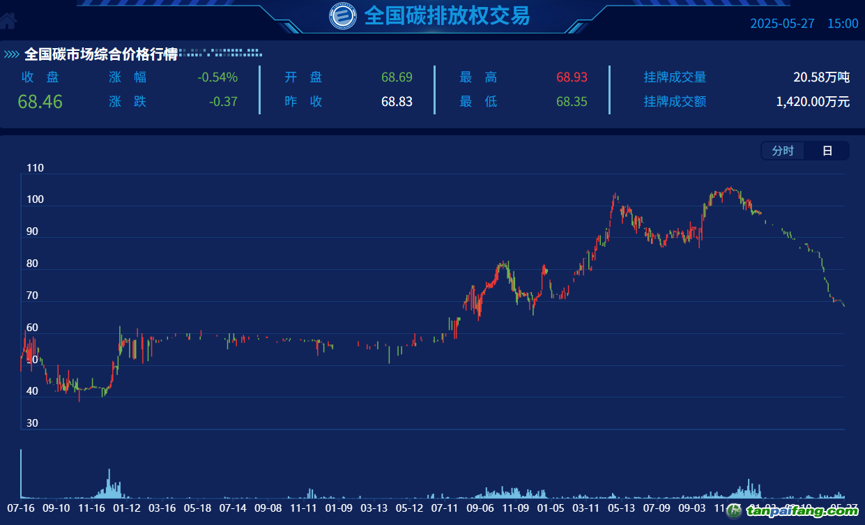 上海環(huán)境能源交易所披露,截至5月27日收盤(pán),CEA價(jià)格為68.46元/噸,較上一交易日下跌0.54%,這也是自去年11月達(dá)到歷史最高點(diǎn)106.2元/噸以來(lái),CEA價(jià)格創(chuàng)下的階段性新低。