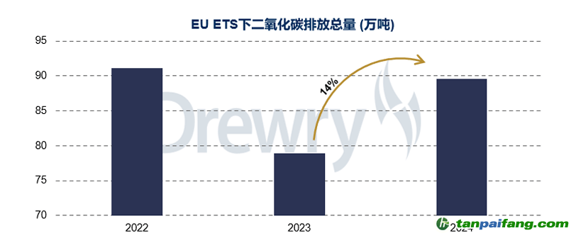 2024年,納入EU ETS范圍的二氧化碳排放總量達(dá)到約9,000萬噸,同比增加14%。這一增幅主要源于地緣政治導(dǎo)致的繞航:部分船舶不得不改道好望角,航程拉長(zhǎng)、燃耗增加,從而推高整體排放。 內(nèi)/容/來/自:中-國-碳-排-放*交…易-網(wǎng)-tan pai fang . com