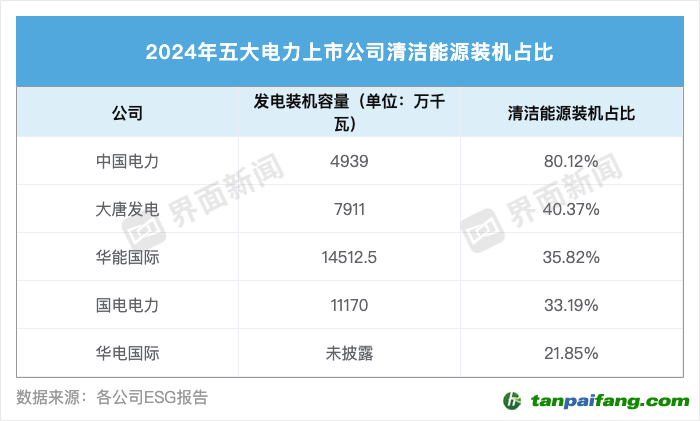五家公司中,中國(guó)電力的清潔能源占比最高,達(dá)到80.12%。華電國(guó)際未在ESG報(bào)告披露該數(shù)據(jù),界面新聞查閱該公司2024年財(cái)報(bào),其清潔能源發(fā)電裝機(jī)約占21.85%。 本文@內(nèi)/容/來(lái)/自:中-國(guó)-碳^排-放-交易&*網(wǎng)-tan pai fang . com