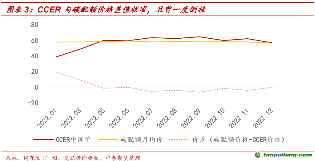 可以說(shuō)全國(guó)碳市場(chǎng)的啟動(dòng)改變了固有的CCER交易市場(chǎng)格局,不僅提高了需求量而且增強(qiáng)了碳配額與CCER價(jià)格的聯(lián)動(dòng)性,現(xiàn)階段持續(xù)的凈消化使得CCER已經(jīng)由供過(guò)于求向供不應(yīng)求迅速轉(zhuǎn)變并反映在價(jià)格端,無(wú)論是從量還是價(jià)兩方面都明顯難以滿足新一輪履約周期企業(yè)需求。 禸*嫆唻@洎:狆國(guó)湠棑倣茭昜蛧 τāńpāīfāńɡ.cōm