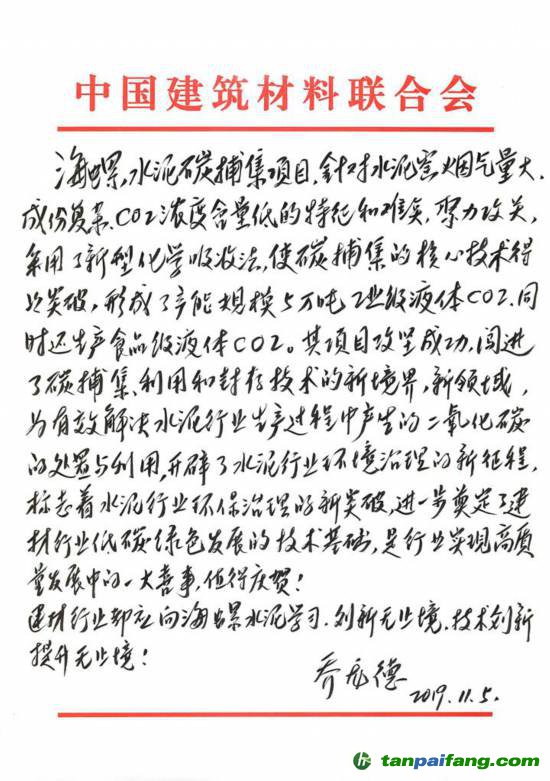 碳捕集項目給予高度評價,表示慶賀,號召建材行業(yè)向海螺水泥學(xué)習(xí)。
