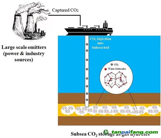 在海洋產(chǎn)生的低溫高壓條件下,二氧化碳會(huì)被困在水分子中,形成類似冰的物質(zhì)。這種二氧化碳水合物形成的溫度剛好高于水的冰點(diǎn),可以在1立方米的水合物中儲(chǔ)存多達(dá)184立方米的二氧化碳。