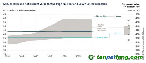 圖4顯示了在船舶脫碳進(jìn)程中,與基準(zhǔn)燃料策略(燃料油、LNG、甲醇和氨)相比,核動(dòng)力推進(jìn)的估算年度成本(CAPEX、OPEX、燃料成本、碳成本)和凈現(xiàn)值。