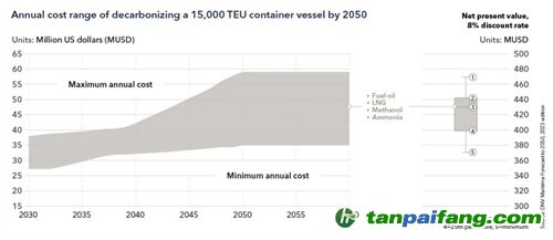 圖2:案例研究船舶的年度成本和凈現(xiàn)值的基準(zhǔn)跨度,燃料策略采用燃油、LNG、氨和甲醇且這四種策略的碳中和燃料混合度均符合要求(《面向2050年的海事展望》2023年版)