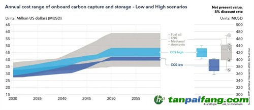 圖3:與基準(zhǔn)相比,船上碳捕獲與儲(chǔ)存(CCS)的低成本場(chǎng)景與高成本場(chǎng)景下、案例研究中的年度成本(左)和凈現(xiàn)值(右)的范圍(《面向2050年的海事展望》2023年版) 本`文@內(nèi)-容-來-自;中^國_碳0排0放^交-易=網(wǎng) ta n pa i fa ng . co m