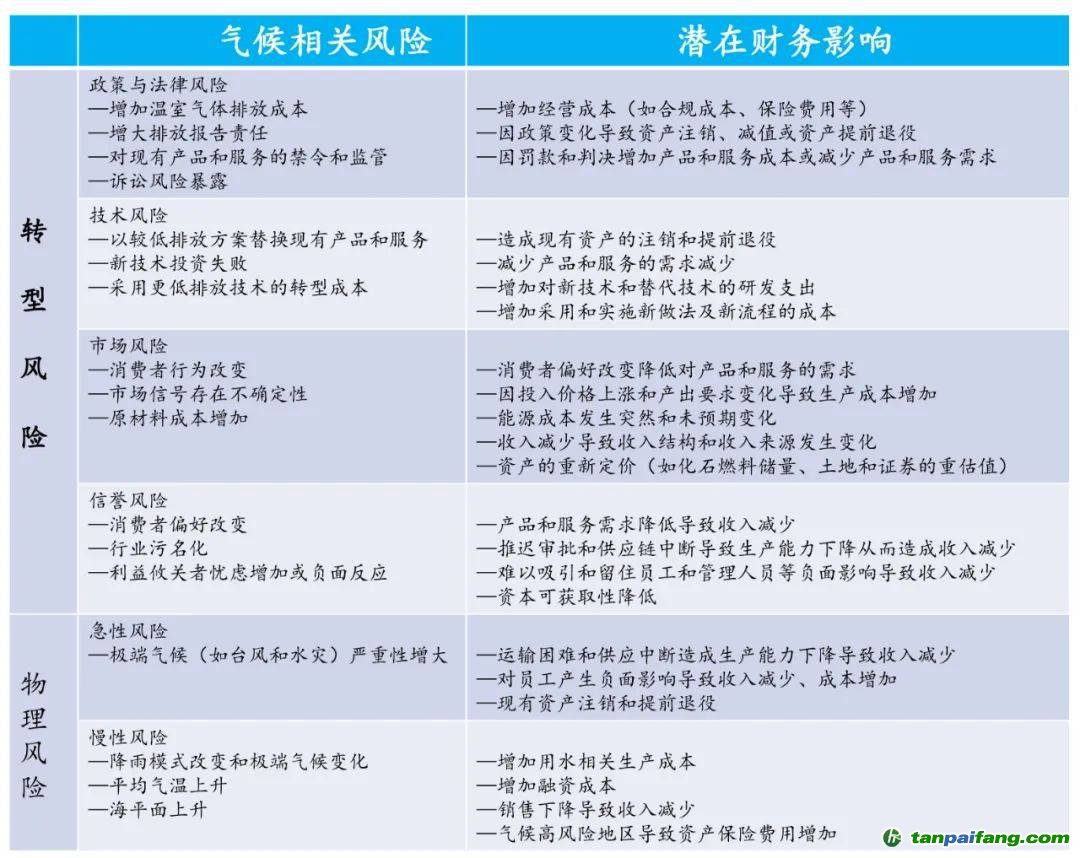 值得說(shuō)明的是,作為FSB的下設(shè)機(jī)構(gòu),TCFD發(fā)布的《信息披露指引》(簡(jiǎn)稱“TCFD指引”)尤其受到大型金融機(jī)構(gòu)的重視,這些金融機(jī)構(gòu)近年來(lái)大力發(fā)展綠色金融,沒(méi)有按照TCFD指引披露氣候相關(guān)信息的企業(yè)將難以獲得這些金融機(jī)構(gòu)的信貸支持,因此TCFD指引得到了企業(yè)廣泛遵循。 本`文@內(nèi)/容/來(lái)/自:中-國(guó)^碳-排-放^*交*易^網(wǎng)-tan pai fang. com