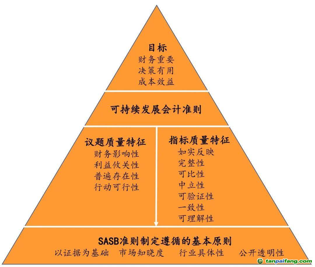 與其他ESG報(bào)告框架相比,SASB發(fā)布的可持續(xù)發(fā)展會(huì)計(jì)準(zhǔn)則(SAS)具有三個(gè)顯著特點(diǎn):一是在2017年頒布了可持續(xù)發(fā)展報(bào)告概念框架(如圖4所示),用于指導(dǎo)SAS的制定;二是正視行業(yè)差異,其所制定的77個(gè)準(zhǔn)則對(duì)應(yīng)77個(gè)不同行業(yè),更具針對(duì)性和適用性;三是每個(gè)準(zhǔn)則均設(shè)定會(huì)計(jì)指標(biāo)和定性指標(biāo),更具可操作性和可驗(yàn)證性。 本+文+內(nèi).容.來(lái).自:中`國(guó)`碳`排*放*交*易^網(wǎng) t a np ai fan g.com