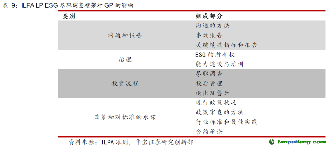 在ILPA最新的3.0準(zhǔn)則中,協(xié)會(huì)為各大LP建立ESG評(píng)估工具提供指導(dǎo),該指導(dǎo)旨在幫助LP評(píng)估自身選擇GP的ESG盡職調(diào)查工作的情況,為后續(xù)與GP溝通提供支撐,并且可以清晰了解GP的ESG整合情況;同時(shí)方便LP了解同行選擇的GP對(duì)于ESG的整合情況。 本@文$內(nèi).容.來(lái).自:中`國(guó)`碳`排*放^交*易^網(wǎng) t a np ai fan g.c om