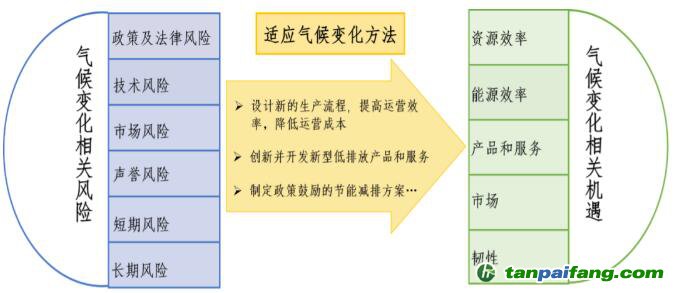 氣候變化給投資者、貸款人、保險承保商和其他利益相關方帶來了多方面的風險,但緩釋和適應氣候變化影響的努力,將能夠為各組織創(chuàng)造更多機遇。為了鼓勵各組織對與其經(jīng)營活動相關性最大的氣候相關風險和機遇進行評估和披露,TCFD定義了氣候相關風險和機遇的分類。氣候變化相關風險和機遇如圖2所示。