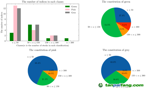 由上文聚類結果,本文進一步統(tǒng)計出各類指數的成分股數目的特征,如圖4所展示??梢钥闯觯挥诰G色區(qū)域的指數的成分股數目普遍偏多,其涉及股票的板塊也相對更豐富,其波動率普遍偏低。而位于粉色和灰色區(qū)域的指數成分股數目的特征基本相同(由圖4下方兩幅餅圖),可能因為指數構建機構的關注點不同導致它們投資績效不同。