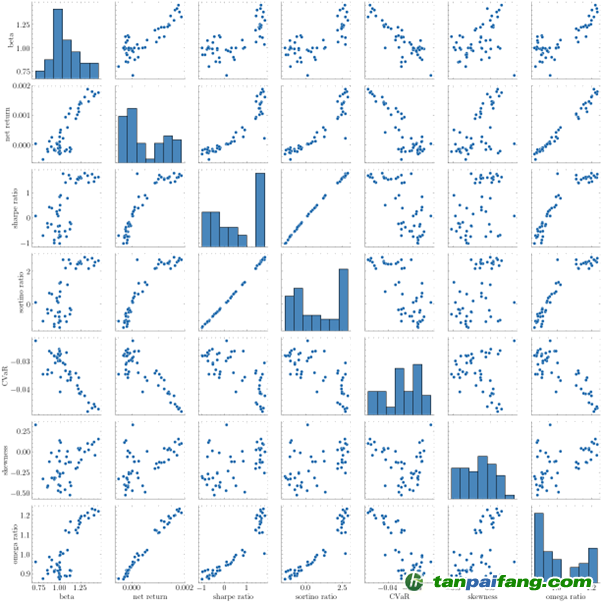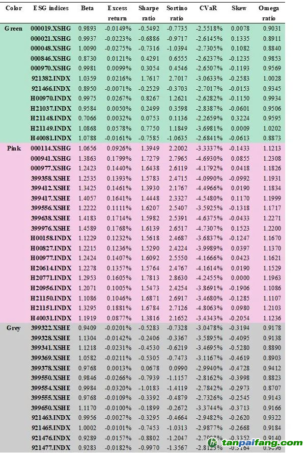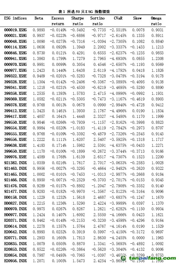 可以看出, 50只ESG指數在其基準指數下的表現(xiàn)并不一致(即存在優(yōu)劣之分),在不同指標衡量下部分的績效優(yōu)劣還會發(fā)生反轉,比如000114.XSHG相比000970.XSHG夏普比率和索提諾比率更優(yōu)(數值更大),但其日收益率的偏度卻比000970.XSHG更小,也就是日收益率分布相對對稱分布而言更向左偏,更容易出現(xiàn)負收益。綜上,不同指數的投資績效有著差距,并且其差距難以使用單一指標進行衡量,需要綜合考慮其7種指標績效相對于其他ESG指數績效的差值來判別其投資績效在眾多指標的情況。 本+文+內/容/來/自:中-國-碳-排-放(交—易^網-tan pai fang . com