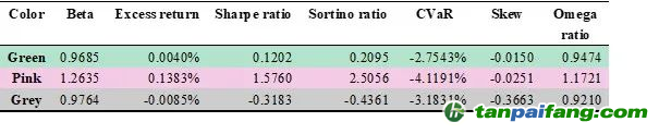 根據結果,無論是類平均績效還是同一類里單只指數績效特點,在綠色區(qū)域的指數相對穩(wěn)健,日收益率波動幅度小,并且凈日收益率大于0,長期持有可以獲得穩(wěn)定收益;在粉色區(qū)域的指數相對于基準指數的波動率最大,日收益率波動最激烈,但其擁有最高的凈日收益率,應證了風險與收益并存的觀點,從夏普比率和索提諾比率來看,這類指數最具有投資價值;在灰色區(qū)域的指數的投資績效最差,其平均日收益不及對應的基準指數,偏度也在三類中最偏左,最具有下行風險。