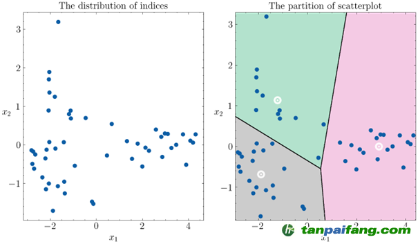 圖3左側是主成分分析降維后50只ESG指數績效的散點分布,可以看出它們分成三大簇聚集。于是本文選擇運用基于歐幾里得距離的K-means算法進行簇個數為3的聚類,生成右側的散點聚類示意圖,圖中的白色點是其所在簇的中心。 內.容.來.自:中`國*碳-排*放*交*易^網 t a npai fa ng.com