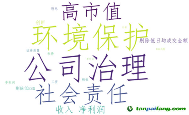 對于綠色區(qū)域指數有著穩(wěn)定收益和低波動率的表現(xiàn),詞云展示的構建關注點也有所解釋。在圖5中可以看到,機構在構建這類詞云時不僅關注了ESG的三大維度,還關注了波動率、證券質量、估值情況、公司凈利潤等方面。所以在構建指數時參考的公司財務情況和股票金融指標也影響著指數的投資績效。而灰色區(qū)域大部分指數對企業(yè)財務情況和股票金融指標不夠重視,部分指數有關注,但將重點放在了創(chuàng)新、市場等方面上,本文推測灰色區(qū)域指數在近兩年內投資績效差的原因可能是指數構建評價標準欠妥導致。