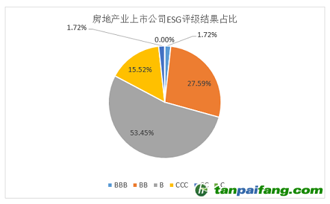 從圖1和圖2 可以看出,本次被評(píng)級(jí)的房地產(chǎn)行業(yè)的58家上市公司中,獲得AAA和AA評(píng)級(jí)的公司數(shù)量為0,ESG評(píng)級(jí)結(jié)果主要分布在BB、B、CCC之間。其中獲評(píng)BBB級(jí)的公司有1家,占比為1.72%;獲評(píng)BB級(jí)的公司有16家,占比為27.59%;獲評(píng)B級(jí)的公司有31家,占比為53.45%,占比最高;獲得CCC 的有9家,占比為15.52%;獲得CC的有1家。整體上,ESG的表現(xiàn)比較差,未來(lái)需要房地產(chǎn)公司重視綠色發(fā)展,加強(qiáng)對(duì)ESG的建設(shè)。 本*文@內(nèi)-容-來(lái)-自;中_國(guó)_碳^排-放*交-易^網(wǎng) t an pa i fa ng . c om