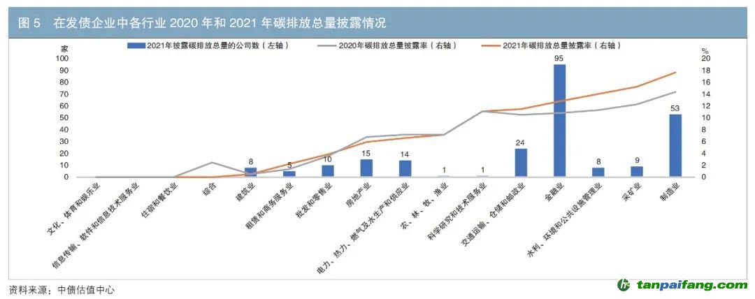 具體來看,在上市公司中,2021年金融業(yè)上市公司對(duì)碳排放總量的披露率達(dá)到46%,較2020年增長8個(gè)百分點(diǎn)(見圖4)。電力、熱力、燃?xì)饧八a(chǎn)和供應(yīng)業(yè),采礦業(yè),交通運(yùn)輸、倉儲(chǔ)和郵政業(yè)的企業(yè)披露率超過10%。在發(fā)債企業(yè)中,2021年披露率超過10%的行業(yè)包括制造業(yè),采礦業(yè),水利、環(huán)境和公共設(shè)施管理業(yè),金融業(yè),交通運(yùn)輸、倉儲(chǔ)和郵政業(yè),這些行業(yè)的披露率較2020年提升了2個(gè)百分點(diǎn)左右(見圖5)。 本+文`內(nèi).容.來.自:中`國`碳`排*放*交*易^網(wǎng) t a np ai fan g.com