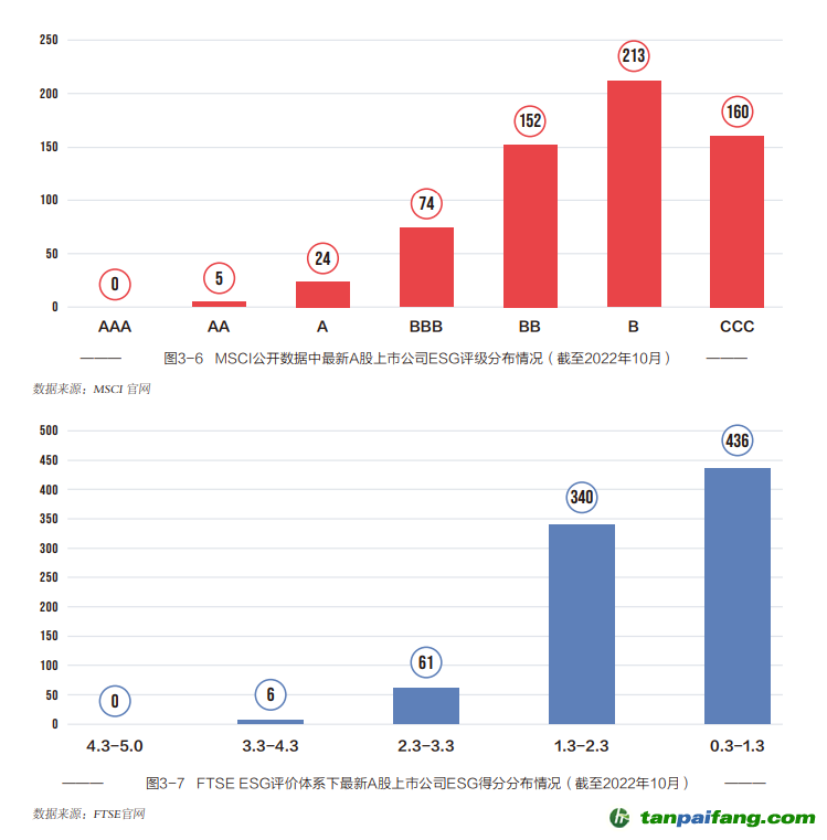 此外,截至2022年10月,在FTSE ESG評分體系下,843家A股上市公司的ESG得分均值約為1.36(滿分為5)。其中,得分在1.3以下的公司有436家(占比51.72%),整體ESG得分偏低。由此可見,當前A股上市公司在MSCI和FTSE的評級體系下ESG評級表現(xiàn)處于領(lǐng)先及平均水平的企業(yè)數(shù)量較少,處于落后水平的企業(yè)數(shù)量較多。