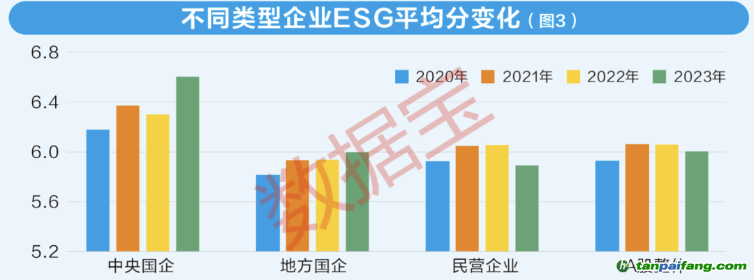 具體來(lái)看,央企ESG評(píng)分整體表現(xiàn)優(yōu)于地方國(guó)企、民企及A股整體水平。央企2023年Wind ESG平均分為6.6分,較2020底提升6.89%,無(wú)論是平均分還是提升幅度均高于地方國(guó)企、民企和A股整體水平(圖3)。 本`文@內(nèi)-容-來(lái)-自;中^國(guó)_碳0排0放^交-易=網(wǎng) ta n pa i fa ng . co m