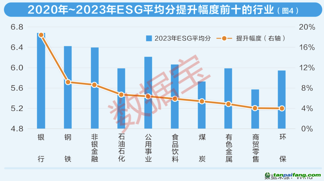 從行業(yè)ESG表現(xiàn)來(lái)看,在樣本量大于30家公司的行業(yè)中,銀行、鋼鐵、非銀金融行業(yè)2023年Wind ESG平均分分別為6.68分、6.42分和6.4分,分別較2020年底提升18.5%、9.2%和8.6%,平均分和提升幅度均位列前三;社會(huì)服務(wù)、通信行業(yè)ESG表現(xiàn)相對(duì)較差,2023年Wind ESG平均分較2020年下降7.1%、3.9%(圖4)。 禸嫆@唻洎:狆國(guó)湠棑倣茭昜蛧 τāńpāīfāńɡ.cōm