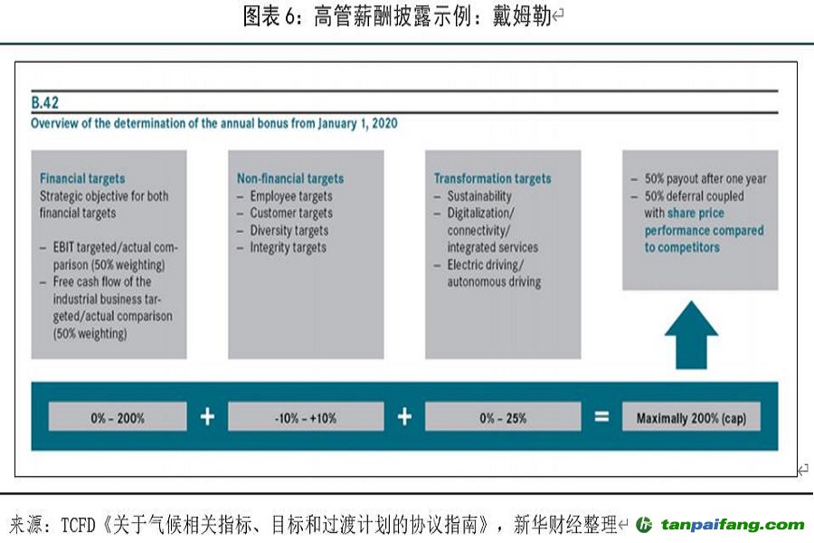 TCFD認為,薪酬政策是實現(xiàn)組織目標和目的的重要激勵措施,也是管理氣候相關(guān)問題的治理、監(jiān)督和問責(zé)制的信號。對氣候相關(guān)績效的高管薪酬將取決于其公司和治理結(jié)構(gòu)。一些組織選擇報告與氣候因素相關(guān)的高管薪酬百分比,而另一些組織則討論權(quán)重因素或總額可能受到影響的賠償。例如,戴姆勒公司以可持續(xù)發(fā)展為導(dǎo)向的目標可使得年度獎金波動范圍最高達+/-25%。