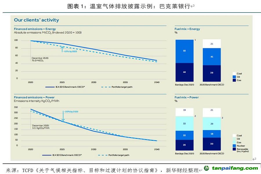 TCFD建議,組織應(yīng)考慮按相關(guān)業(yè)務(wù)線披露溫室氣體排放量,以及按《京都議定書》涵蓋的七種氣體劃分的溫室氣體排放量。已設(shè)定溫室氣體減排目標的組織,還應(yīng)考慮披露相對溫室氣體排放量到用于其目標的基線年份,以了解潛在的超調(diào)動態(tài)。例如,巴克萊銀行預(yù)計到2025年,其電力組合排放強度將減少30%,到2035年將與經(jīng)合組織設(shè)立的IEA SDS基準保持一致。 本文@內(nèi)/容/來/自:中-國-碳^排-放-交易&*網(wǎng)-tan pai fang . com