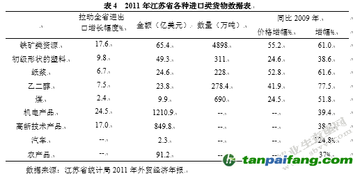 江蘇省2011年外貿(mào)總額相比2010年取得了大幅提升,全年實現(xiàn)進出口5397.6億美元,增幅達到15.9%,兩項數(shù)據(jù)均突破了江蘇省單月進出口貿(mào)易額的歷史記錄。在全年的進口貨物種類中,由于生產(chǎn)需求的增大和國際大宗資源類貨物的價格持續(xù)上漲,進口金額有大幅增長,具體見表4。