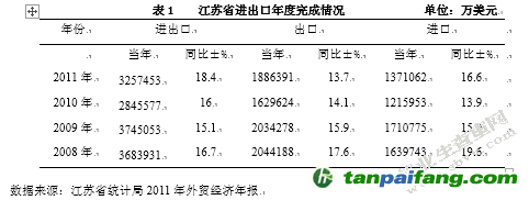 在我國對外貿(mào)易中,江蘇省是發(fā)展比較早,且具有很強外貿(mào)出口經(jīng)濟實力的省份,引進外資量也處在全國各省份排名的前列。在對外貿(mào)易整體發(fā)展較快的時代背景下,江蘇省的外貿(mào)進出口也呈現(xiàn)快讀發(fā)展的勢頭,對外貿(mào)易總經(jīng)濟量也有較大幅度的增幅。隨著全球經(jīng)濟發(fā)展速度逐步擺脫經(jīng)濟危機,逐步復(fù)蘇,我國經(jīng)濟發(fā)展持續(xù)較快的增長,在國家以穩(wěn)定出口、擴大進口的外貿(mào)經(jīng)濟指導(dǎo)方針的指引下,江蘇省外貿(mào)企業(yè)整體競爭力得到不斷的加強,外貿(mào)總量也得以全面恢復(fù),2010年全年呈現(xiàn)高開局面,并保持穩(wěn)定發(fā)展趨勢,對外貿(mào)易總量創(chuàng)歷史新高。