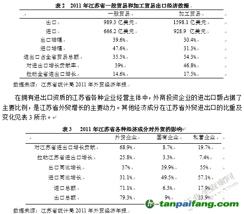 江蘇的加工貿(mào)易由于原材料和銷售地都不在省內(nèi),在2008年開始的世界金融危機中受到的影響很大。導(dǎo)致2011年江蘇省的一般貿(mào)易增幅要高于加工貿(mào)易,兩種貿(mào)易的增幅差距逐步逐增大,江蘇省一般貿(mào)易和加工貿(mào)易出口經(jīng)濟數(shù)據(jù)具體見表2所示。2011年5月以來,江蘇省一般貿(mào)易進出口增幅快于加工貿(mào)易,并有逐步擴大趨勢,第四季度加工貿(mào)易進口僅實現(xiàn)個位數(shù)增長。