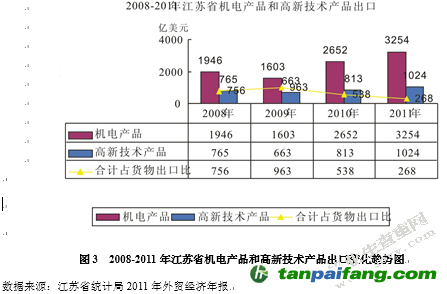 這是由于規(guī)模效應(yīng)使得江蘇省貿(mào)易出口含碳排放降低,隨著出口增長從2008年7月的28.04%降到2011年10月的29.14%,規(guī)模效應(yīng)的影響也從2008年7月的20.66%降到2009年1月的3.75%,到2011年10月規(guī)模效應(yīng)對出口碳排放降幅影響高達26.85%。2011年1月結(jié)構(gòu)使得出口碳同比下降2.78%,同年10月這一數(shù)據(jù)擴大到6.09%,由此可見江蘇省出口貿(mào)易結(jié)構(gòu)在逐步向低碳轉(zhuǎn)型,圖3為2008年至2011年低碳技術(shù)含量較高的機電產(chǎn)品和高新技術(shù)產(chǎn)品出口變化趨勢簡圖。