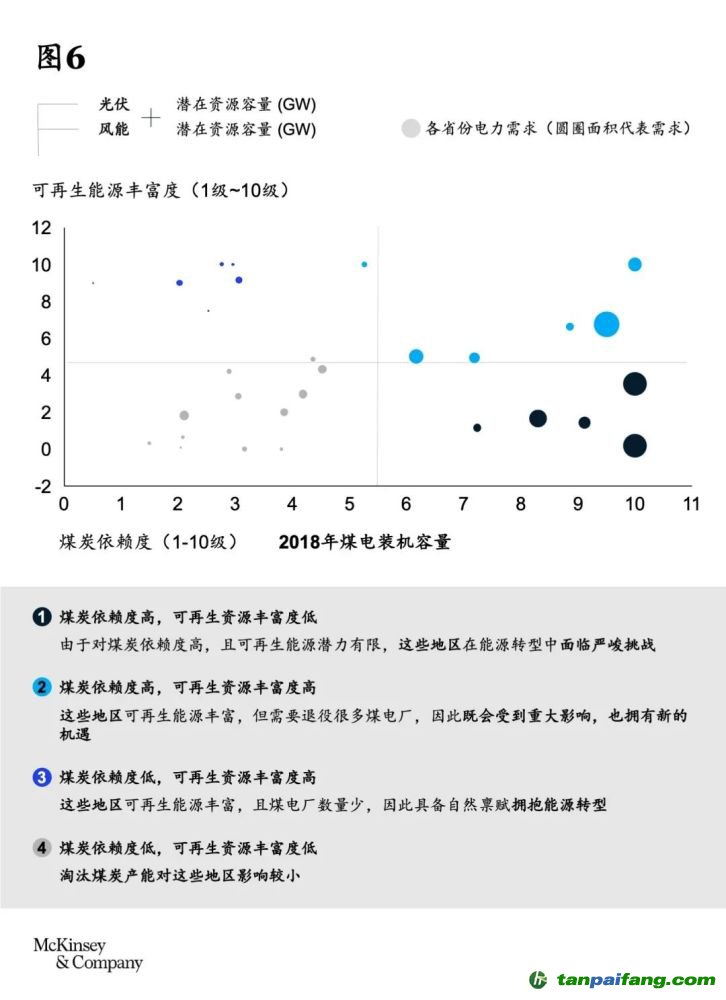 若電力行業(yè)碳排放需在2050年“清零”,燃煤電廠將不可避免地退出歷史舞臺(tái)。中國目前的燃煤發(fā)電裝機(jī)容量達(dá)1,100GW,超過50%需在2040年前逐步淘汰。雖然中央及各省正陸續(xù)出臺(tái)逐步淘汰燃煤電廠的政策,但落地過程中不僅面臨著供電穩(wěn)定性挑戰(zhàn),也一定程度影響了煤炭高度依賴區(qū)域的短期經(jīng)濟(jì)增長。麥肯錫將中國各省按煤炭依賴程度和可再生能源的豐富程度進(jìn)行了劃分(見圖6),對(duì)于不同類型的區(qū)域,應(yīng)采取不同的煤電退出路徑。 本文`內(nèi)-容-來-自;中_國_碳_交^易=網(wǎng) tan pa i fa ng . c om