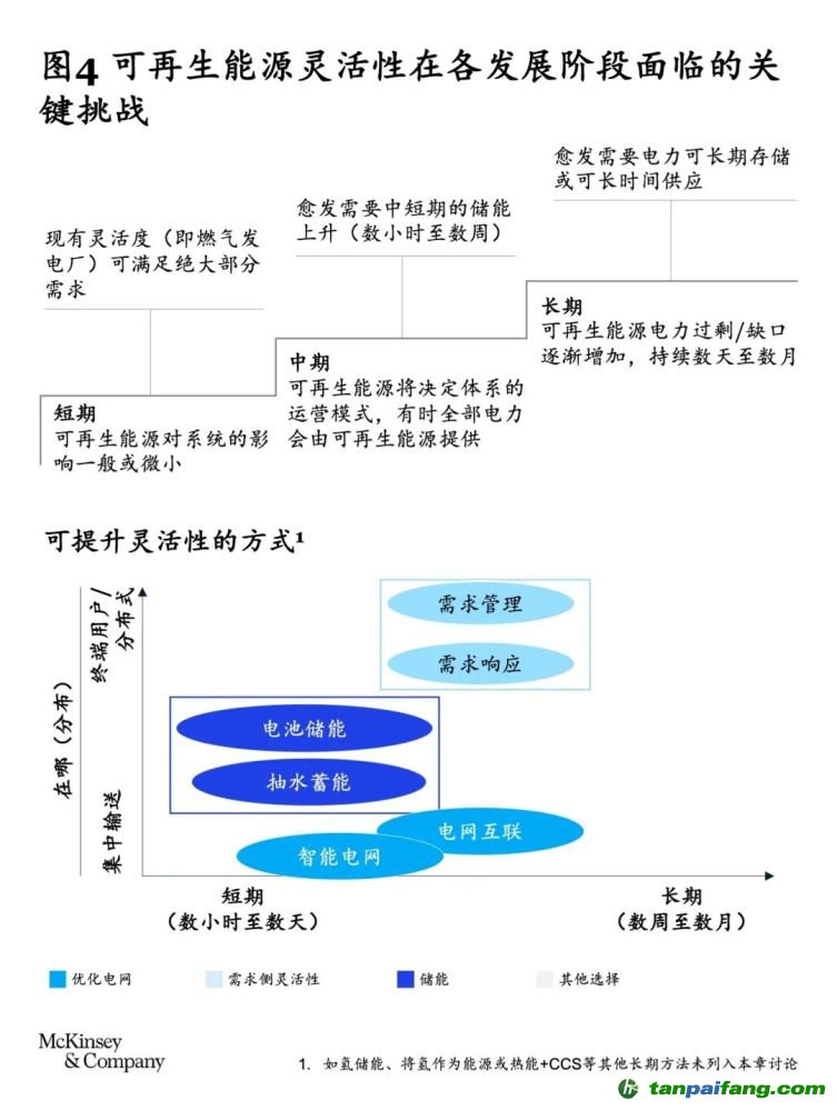 光伏和風(fēng)電將在2050年成為主要能源,占全社會(huì)發(fā)電量的83%,而鑒于光伏和風(fēng)電都有連續(xù)性較差、存在地理限制、容易出現(xiàn)短期內(nèi)過?;蚨倘钡忍攸c(diǎn),將使得電力系統(tǒng)的靈活性受到進(jìn)一步威脅。麥肯錫認(rèn)為,應(yīng)通過建設(shè)以下三方面的能力來提升電力系統(tǒng)靈活性(見圖4)。 內(nèi).容.來.自:中`國`碳#排*放*交*易^網(wǎng) t a np ai f an g.com
