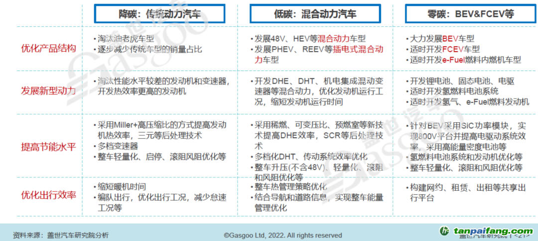 其實,在企業(yè)發(fā)展的不同階段,其所采取的技術路線和減碳的目標路徑也不盡相同。傳統(tǒng)動力汽車的首要目標是降碳,在產(chǎn)品層面可以從淘汰油老虎車型、逐步減少傳統(tǒng)車型的銷量占比入手;混合動力汽車是向低碳邁入的關鍵一步,則需要企業(yè)重點發(fā)展多樣化的混合動力車型;最終要實現(xiàn)零碳,則需要更多BEV和FCEV產(chǎn)品的加入,企業(yè)也要適時開發(fā)e-Fuel燃料內(nèi)燃機車型。 本*文@內(nèi)-容-來-自;中_國_碳^排-放*交-易^網(wǎng) t an pa i fa ng . c om
