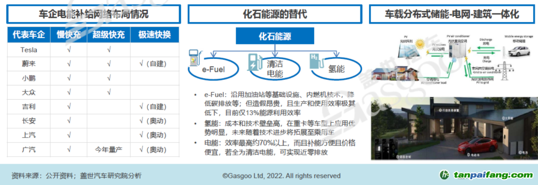 現(xiàn)階段,國家和企業(yè)層面都在加速創(chuàng)建充換電站補能體系,近期目標是通過企業(yè)自建和兼顧市面上已有的第三方充電樁的方式,逐步形成慢充、快充、超級快充和極速快充的電能補給網(wǎng)絡;中期目標是快速導入可再生清潔能源,實現(xiàn)電能對化石能源的消費替代和清潔電能對火電的生產(chǎn)替代;遠期則著眼于利用V2G等技術實現(xiàn)削峰填谷,并將車載分布式儲能與住宅、辦公樓、工廠、商場等場所形成能源聯(lián)動網(wǎng)絡,從而降低社會整體的電能消耗。
