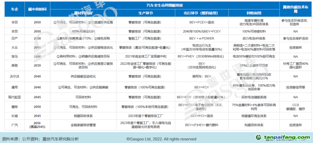 大力發(fā)展低碳和零碳技術,圖片來源:蓋世汽車研究院面對雙碳壓力,優(yōu)化產(chǎn)品結構、發(fā)現(xiàn)新型動力,已經(jīng)成為各大車企的共識。前文提到的豐田、大眾和日產(chǎn)為了在2050年實現(xiàn)碳中和目標,均提出要加大電氣化車型的銷量占比,同時在生產(chǎn)技術領域制定了應對策略。 本*文`內(nèi)/容/來/自:中-國-碳^排-放“交|易^網(wǎng)-tan pai fang . c o m