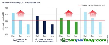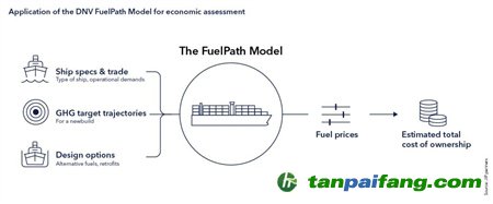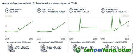 JIP 應(yīng)用 DNV FuelPath模型來評(píng)估設(shè)計(jì)方案的經(jīng)濟(jì)性能,即特定船舶可用的燃料和能源效率策略?;诓煌募僭O(shè)和情景,該模型可幫助船東確定能夠適應(yīng)未來變化并在船舶生命周期內(nèi)各種情景下都能表現(xiàn)良好的設(shè)計(jì)方案。績效以總擁有成本和其他經(jīng)濟(jì)參數(shù)來表示。由于未來的燃料價(jià)格難以預(yù)測,因此該研究考慮了三種不同的燃料價(jià)格情景(高、基線、低)。 本文+內(nèi)-容-來-自;中^國_碳+排.放_(tái)交^易=網(wǎng) t a n pa ifa ng .c om