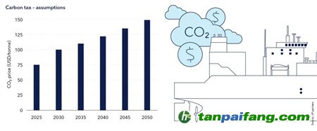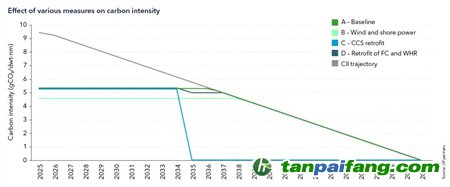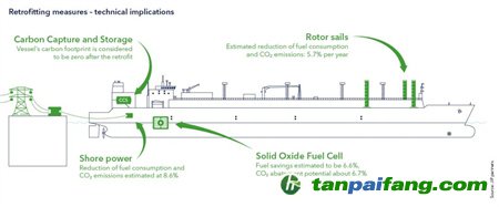 船舶在港時(shí)使用岸電將進(jìn)一步減少燃料消耗,并將二氧化碳排放量減少約8-9%(相對于年總排放量),前提是??扛劭趽碛兴璧幕A(chǔ)設(shè)施。船上碳捕獲和儲(chǔ)存 (CCS) 需要對船上進(jìn)行重大改造,例如額外的甲板以容納系統(tǒng)和二氧化碳?xì)夤?。為系統(tǒng)供電所需的額外燃料(約 24%)不會(huì)影響船舶的碳足跡,改裝后碳足跡被認(rèn)為是零。 本*文@內(nèi)-容-來-自;中_國_碳^排-放*交-易^網(wǎng) t an pa i fa ng . c om
