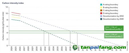 圖表中船舶的碳強(qiáng)度(顯示為任一運(yùn)營模式的水平線)與2050 年和 2040 年的脫碳軌跡相交的點(diǎn),顯示了改造節(jié)能措施和碳減排技術(shù)和/或開始使用碳中和燃料混合的最晚時(shí)間,使船舶能夠繼續(xù)遵守排放限制。