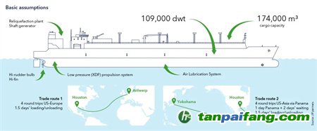 該原型船是一艘 109, 000dwt的LNG運(yùn)輸船,能裝載174, 000立方米LNG,配備低壓(XDF)推進(jìn)系統(tǒng)和再液化裝置。