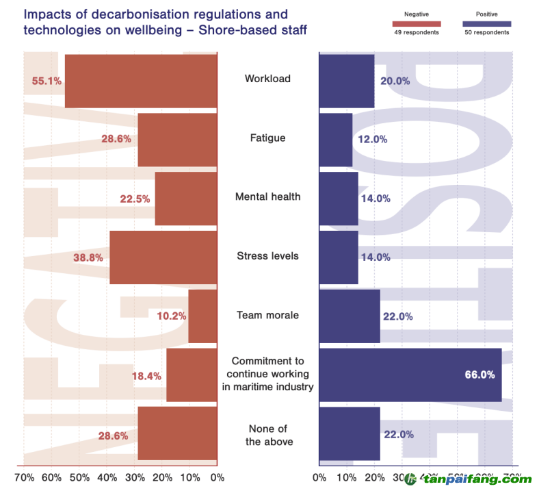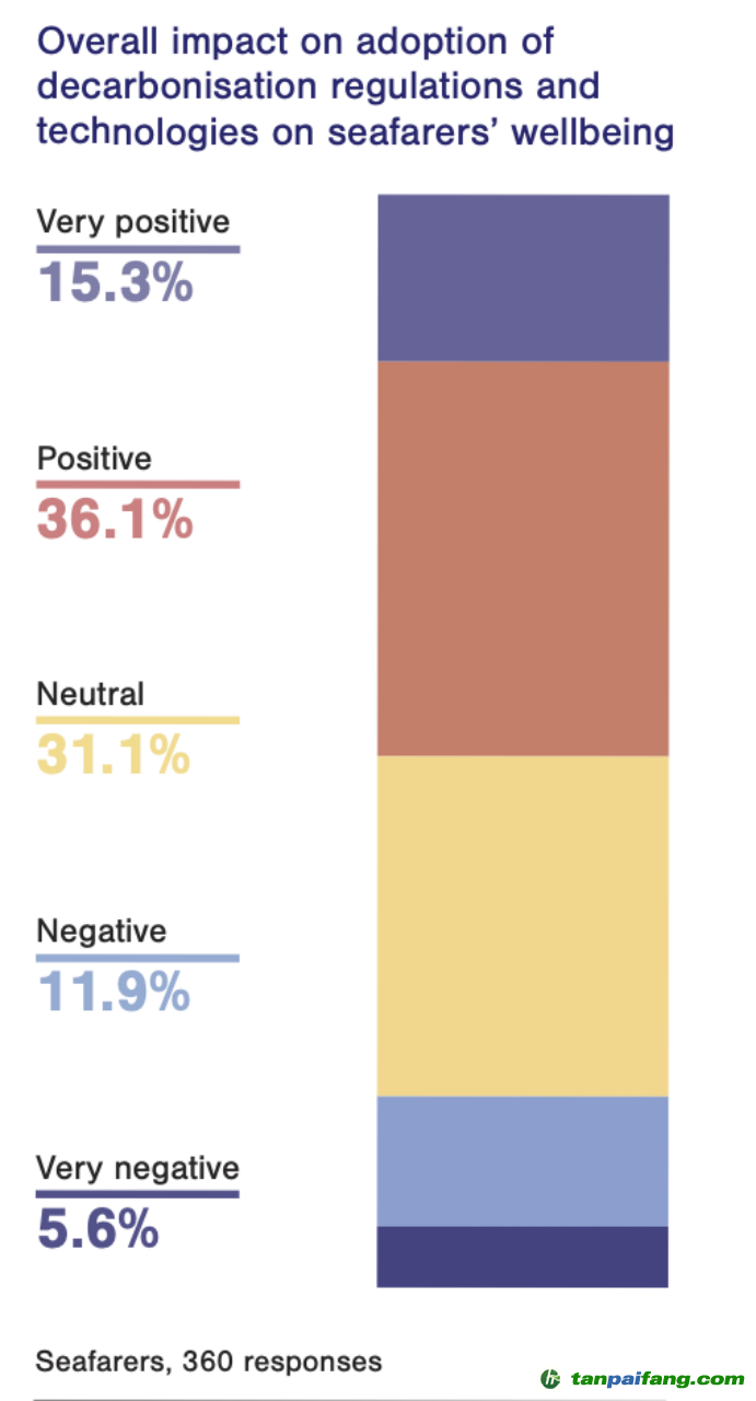 新環(huán)境法規(guī)的采用顯然對(duì)海員的工作生活產(chǎn)生了重大影響。總體而言,高于 70% 的受訪者表示,與脫碳相關(guān)的環(huán)境法規(guī)對(duì)他們的工作產(chǎn)生了較大(43.7%)的影響,其他人員表示受到(26.6%)的影響。 禸*嫆唻@洎:狆國(guó)湠棑倣茭昜蛧 τāńpāīfāńɡ.cōm