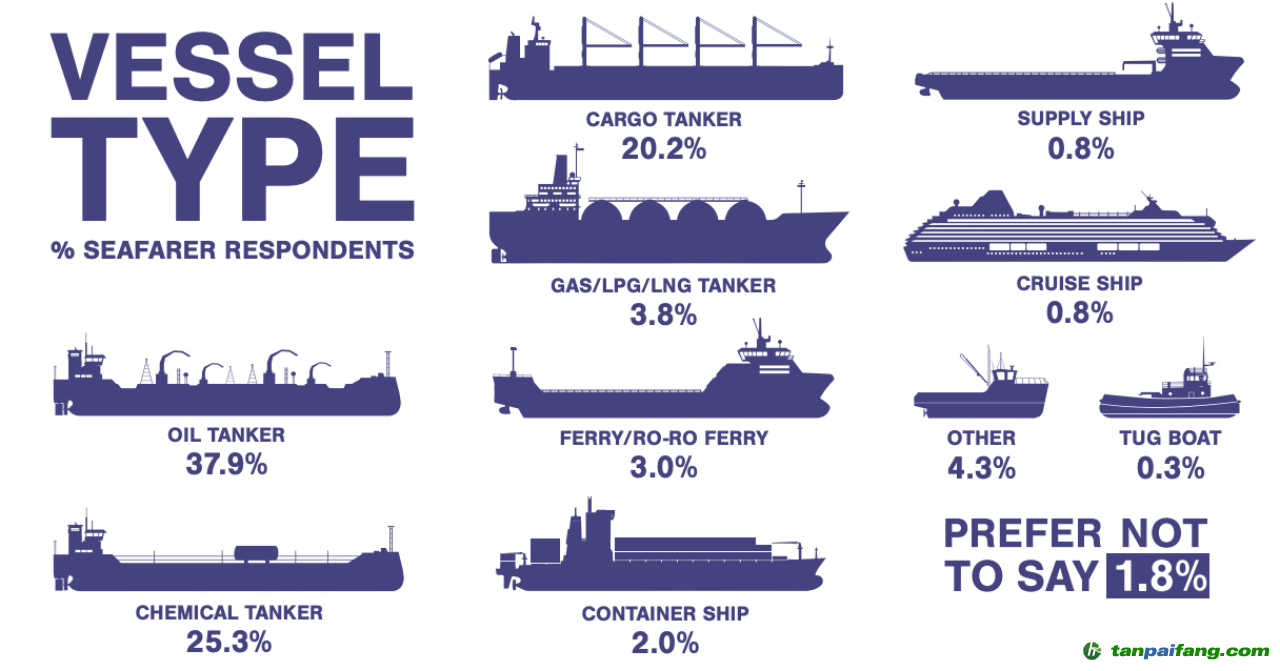 大多數(shù)受訪者(83.4%)在油輪(37.9%)、化學(xué)品船(25.3%)或貨輪(包括普通貨輪或散裝貨輪)上工作(20.2%)。大約超過一半的受訪者(54.8%)在沒有固定貿(mào)易模式的船舶上工作。