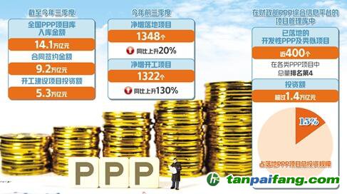 近年來,我國在基礎(chǔ)設(shè)施和公共服務(wù)領(lǐng)域大力推廣PPP,并取得快速發(fā)展。統(tǒng)計(jì)顯示,截至今年三季度,全國PPP項(xiàng)目庫入庫金額達(dá)到14.1萬億元,合同簽約金額9.2萬億元,開工建設(shè)項(xiàng)目投資額為5.3萬億元。今年前三季度凈增落地項(xiàng)目1348個(gè),同比上升20%;凈增開工項(xiàng)目1322個(gè),同比上升130%。