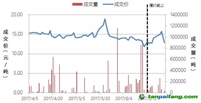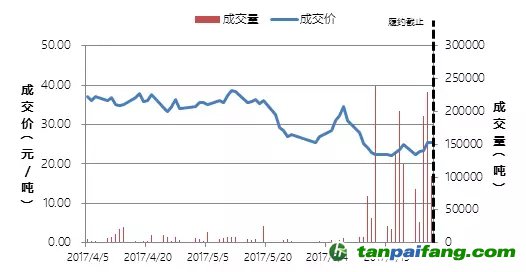 深圳共有8家企業(yè)未按時(shí)履約,大多數(shù)為電子電器制造類企業(yè)。在6月之前,除了5月中旬的幾筆大額交易,深圳的交易量較低。進(jìn)入6月以后,成交量呈現(xiàn)明顯的上升趨勢(shì),并一直持續(xù)到履約截止日期以前。價(jià)格維持在30元/噸左右,變動(dòng)不大。