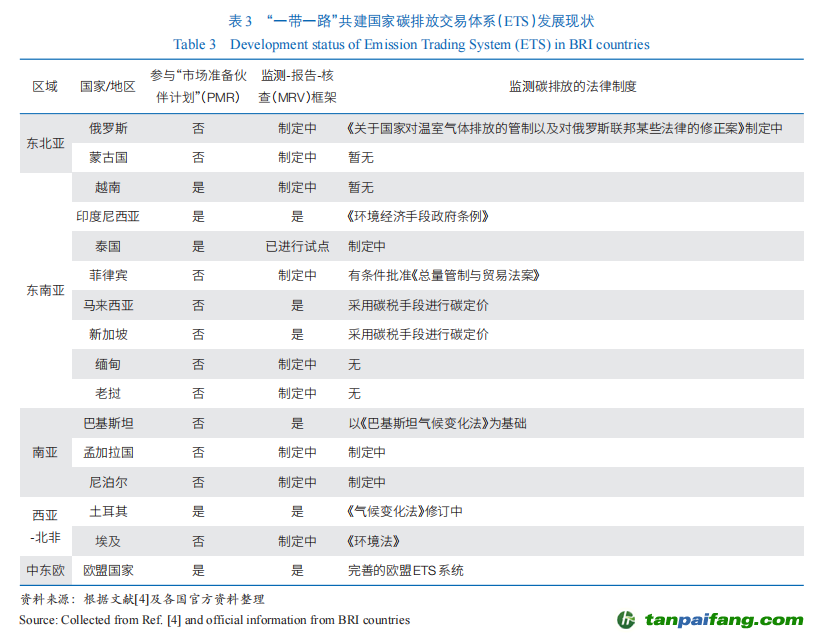 碳定價政策被認為是實現(xiàn)碳減排的重要手段。由于實施碳交易市場體系涉及技術、法律制度等多方面準備,而大部分“一帶一路”共建國家缺乏對碳排放的監(jiān)測-報告-核查(MRV)體系,已經實施和準備實施碳排放交易體系(ETS)的“一帶一路”共建國家仍是少部分(表3)。此外,排放額限定,以及交易制度和相關法律的缺失,也阻礙了“一帶一路”共建國家碳排放交易體系的發(fā)展。例如,泰國等國家仍處于地區(qū)或城市試點階段,以確定排放交易限額設置的合理性及交易細則。目前,一些國家雖然對排放已經進行了限制,但在執(zhí)行和處罰措施上仍存在較大進步空間,未來在排放制度準備(如法律起草、明確框架制度約束)上也有較大需求。 本+文`內.容.來.自:中`國`碳`排*放*交*易^網 t a np ai fan g.com