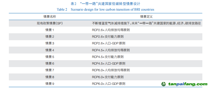 上述“一帶一路”共建國家低碳轉型路徑不僅受全球升溫幅度控制目標的影響,也與全球碳排放空間的分配方式密切相關。雖然《巴黎協(xié)定》提出到21世紀末將全球升溫幅度控制在2℃/1.5℃以內的目標,但全球目前的氣候政策與行動還遠不能達到上述目標,未來全球升溫仍存在不確定性。考慮到升溫和碳排放空間分配的不確定性,本文綜合典型濃度路徑(RCP),從主權公平和過程公平角度,設置了不同RCP情景(RCP2.6、RCP4.5和RCP6.0)和分配模式(人均排放均等原則、支付能力原則、人口-GDP原則)相結合的9種情景(情景1—9);與此同時,為分析不同情景下“一帶一路”共建國家的能源低碳轉型路徑,本文設置了“現(xiàn)有政策情景”作為對照情景(表2)。 本+文+內/容/來/自:中-國-碳-排-放(交—易^網-tan pai fang . com