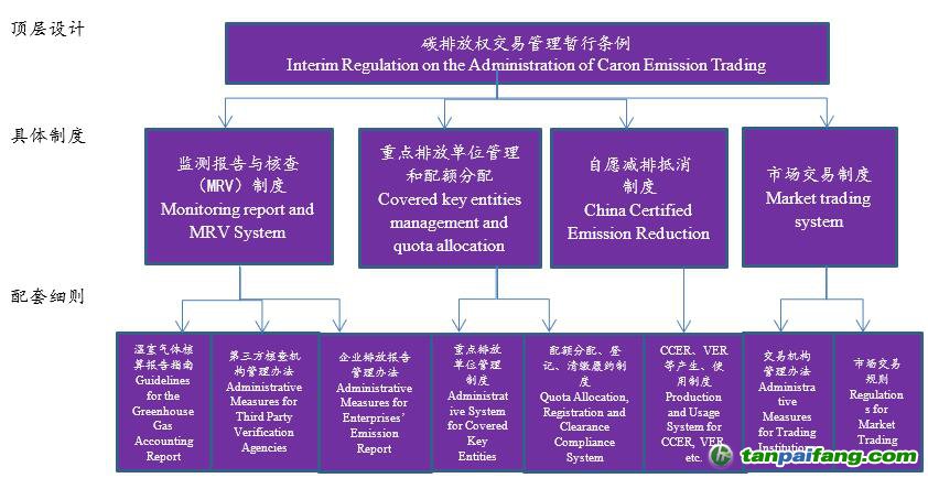 2) 具體制度規(guī)范,主要解決碳市場(chǎng)正常運(yùn)行的相關(guān)問(wèn)題,包括監(jiān)測(cè)報(bào)告與核查(MRV)制度、重點(diǎn)排放單位管理和配額分配、抵消制度、市場(chǎng)交易制度等。