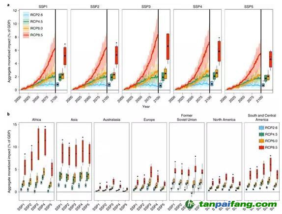 在預測氣候變化的經濟影響時具有較大的不確定性,這些不確定性主要來源于氣候響應、氣候變化減緩路徑和社會經濟發(fā)展路徑。盡管這些因素的相對貢獻對氣候變化相關決策很重要,但是人們對其了解甚少。因此,本文旨在研究氣候變化的經濟影響與人為因素的關聯程度。文章模型框架由全球多部門影響模型(multisectoral impact models)與綜合評估模型耦合連接,使研究者能夠在納入這些不確定性來源的同時,估算氣候變化對全球經濟的總體影響。研究針對9個特定領域:農業(yè)生產力變化、糧食不足、與高溫相關的死亡、供暖需求、職業(yè)健康成本、水力發(fā)電能力、火力發(fā)電能力、河流洪水和氣候變化造成的沿海淹沒;包括5種共享社會發(fā)展路徑、4種氣候變化減緩路徑(由RCP情景表示)和5種不同的氣候模型組合,用以研究氣候響應中的不確定性。