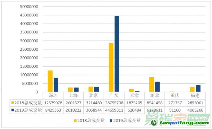 圖1.試點(diǎn)碳市場(chǎng)2018、2019年度成交總量