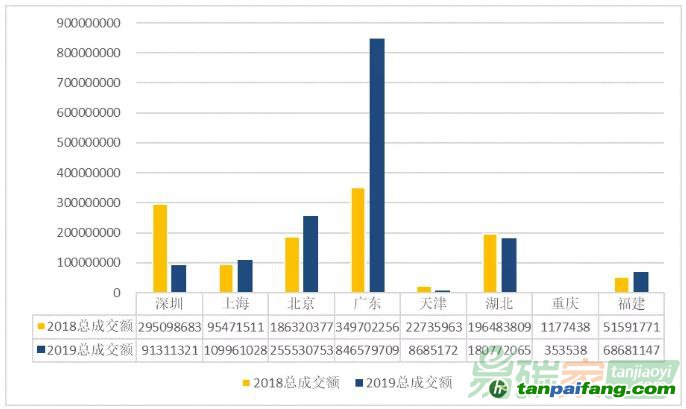 圖2. 試點(diǎn)碳市場(chǎng)2018、2019年度成交總額