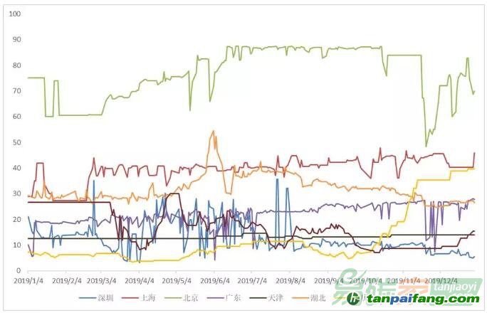 2019年北京碳市場的碳價遠高于其他試點碳市場,日均成交價上達87.48元/噸,下探到48.40元/噸,日均成交最低價仍高于其余市場的日均成交最高價。重慶市場的碳價為八試點中最低,前三季度在10元/噸以下波動,最低達到3.38元/噸,但從第四季度開始經(jīng)歷了一波短期上漲,在年末達到峰值39.7元/噸。深圳碳市場價格波動劇烈且較頻繁,最低達到3.3元/噸,最高達到35.64元/噸。其余試點碳市場除個別極值影響外,價格均較為平穩(wěn)波動。